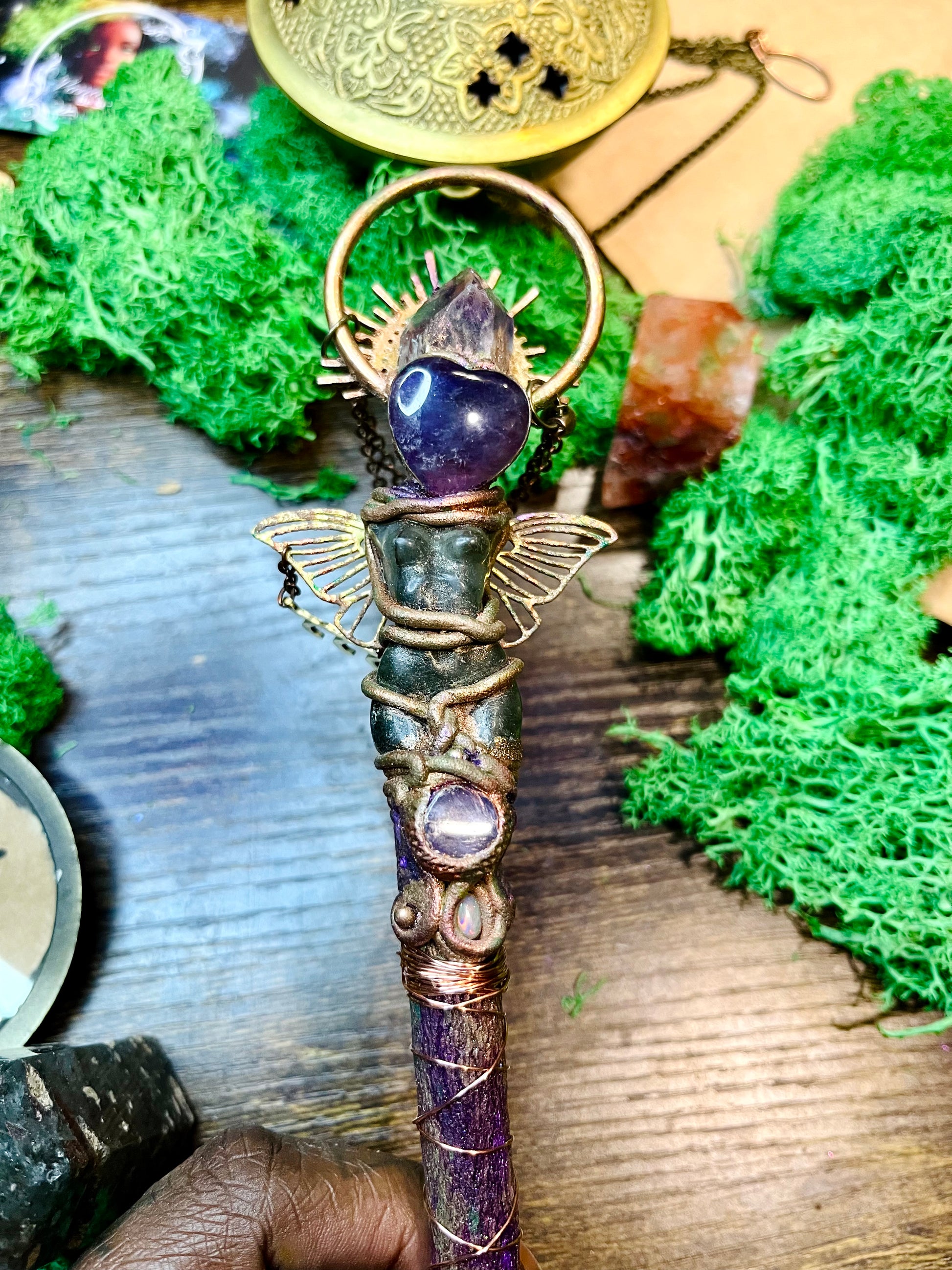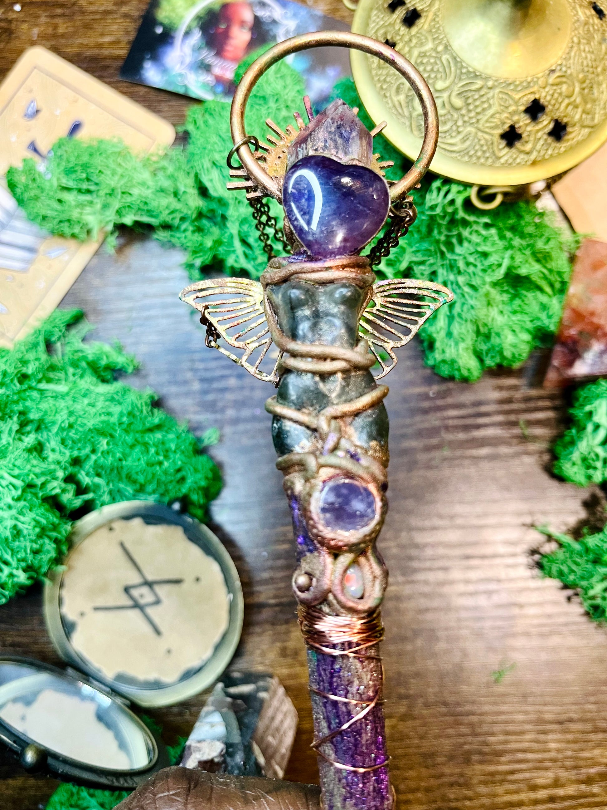 With the 777GODDESS, reach new heights in spiritual growth with its Amethyst heart, Opal for intuition, and Labradorite for transformation. The wing detail symbolizes freedom while the sun charm promotes focused thoughts. This 10” pencil is also wrapped in protection. Embrace your inner goddess with 777GODDESS.