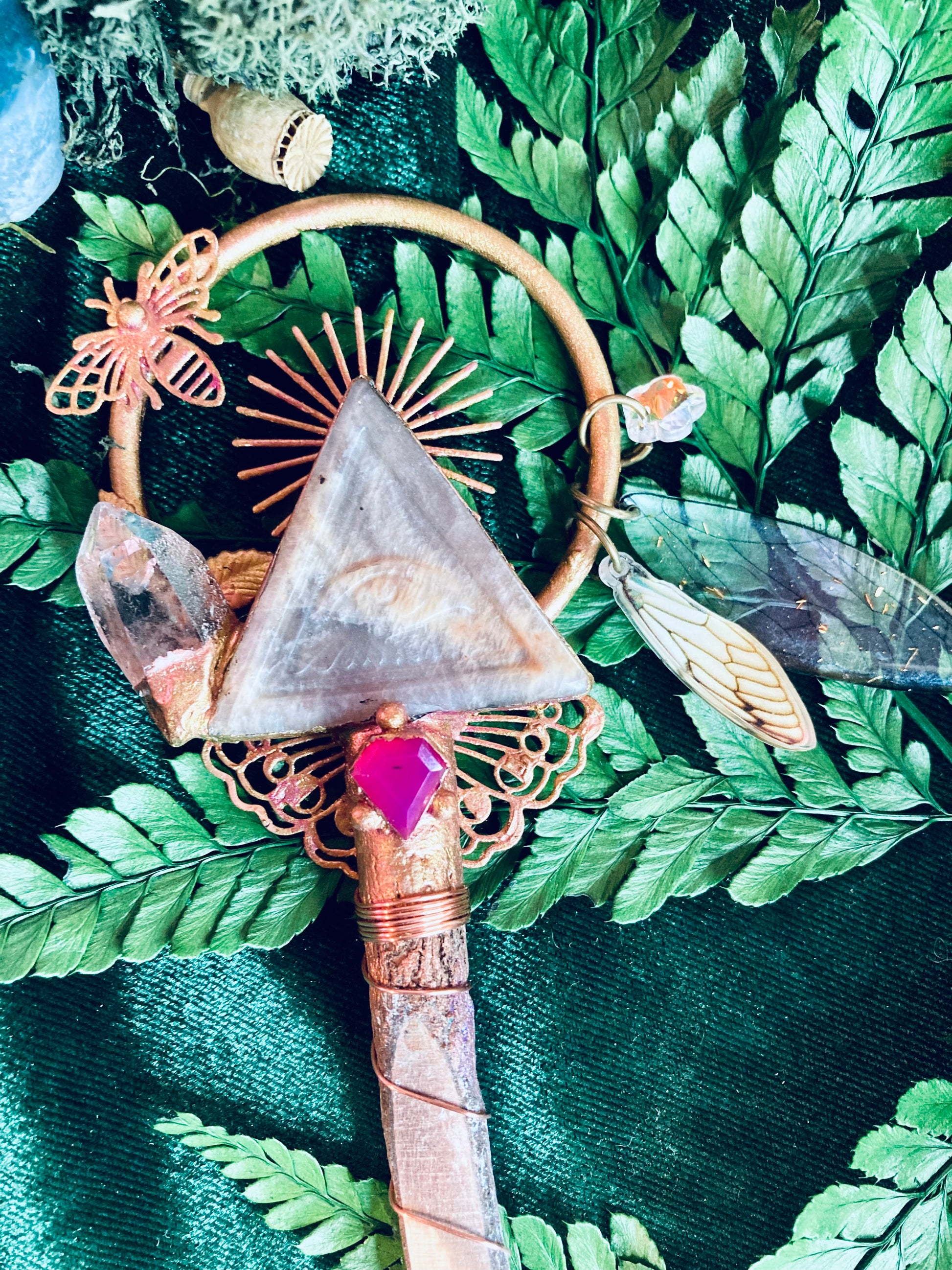 Introducing Eye, featuring an clear Quartz, Moon stone and Hot Pink Chalcedony. Clear quartz cleanses the chakras and protects against negative energies, promoting healing and higher consciousness. Experience the benefits of these powerful gemstones for yourself. Discover the power of hope with the Fairy Pencil Eye.