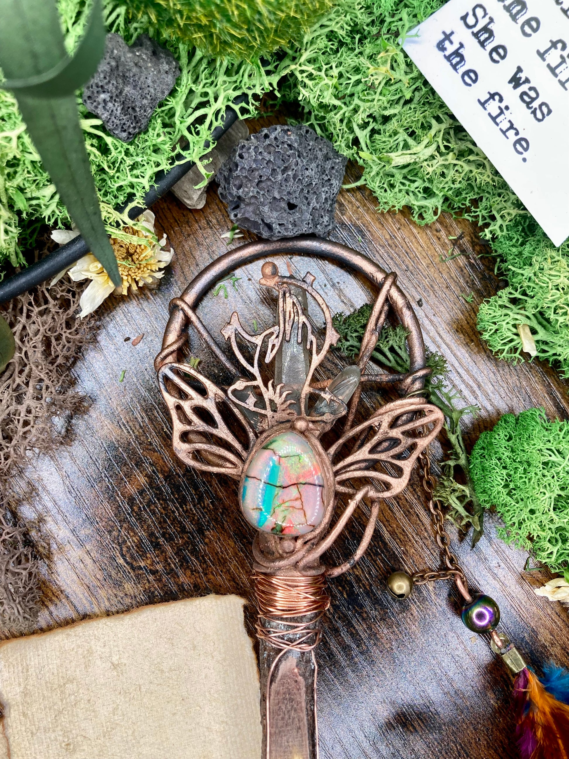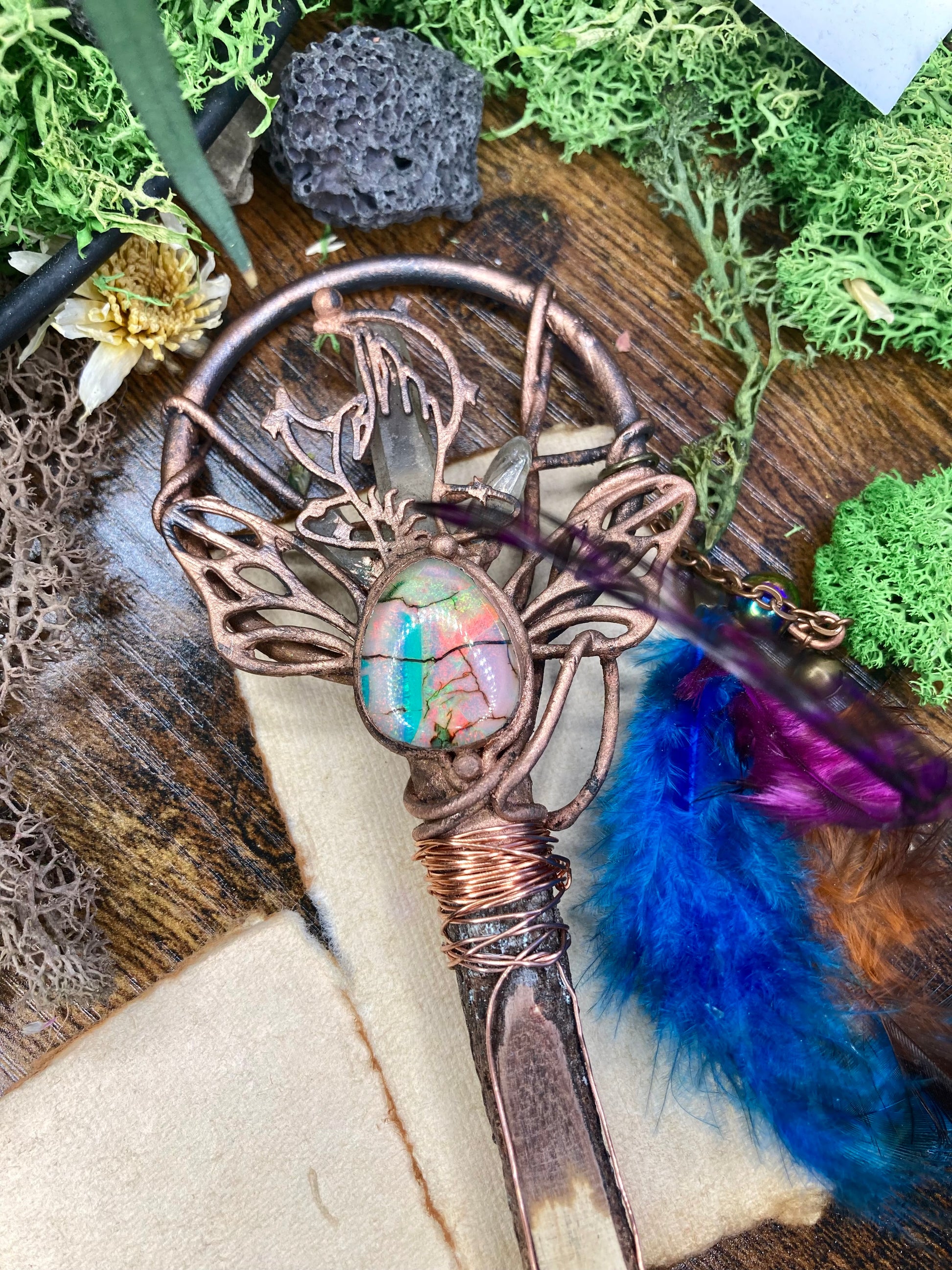 Introducing Fairy Pencil wand Eye Opener, featuring an opal and clear quartz pencil wand. The opal symbolizes hope and truth, and can bring clarity to unclear situations. Clear quartz cleanses the chakras and protects against negative energies, promoting healing and higher consciousness. Experience the benefits of these powerful gemstones for yourself. Discover the power of hope with the Fairy Pencil wand Eye Opener. Featuring an opal and clear quartz pencil wand, this product brings clarity to unclear situations and promotes healing and higher consciousness. Put the power of gemstones to work for you today.