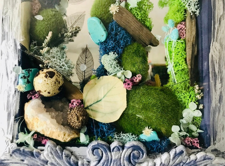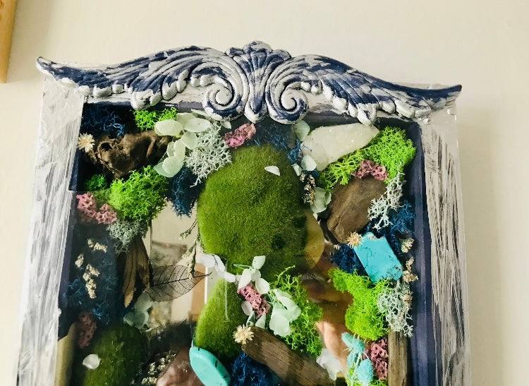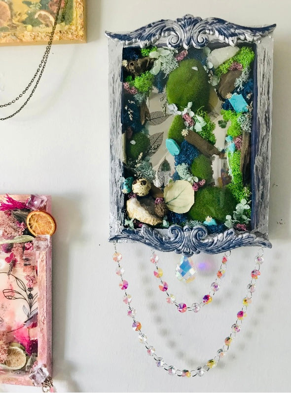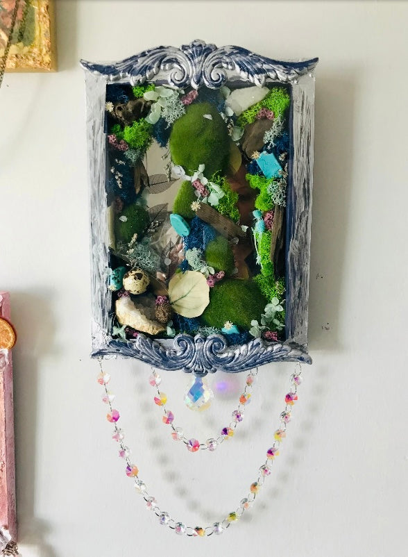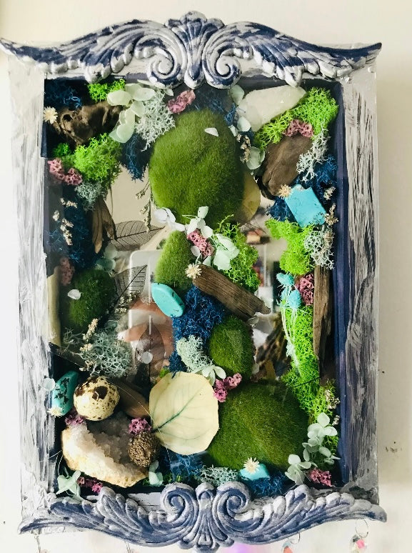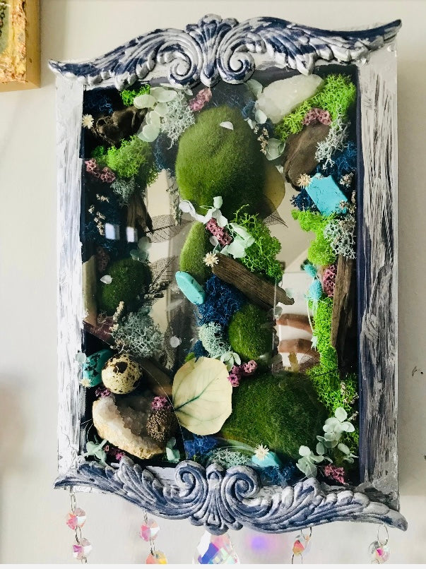 This Little Blue Egg Moss Art is a one-of-a-kind work of art, featuring a blue jay egg, Quartz crystal, amazonite crystal, and lush foliage. This 9x12 piece adds a beautiful, bright aesthetic to any room. Stunning details of broken mirrors and sun catcher make this a unique and special design.