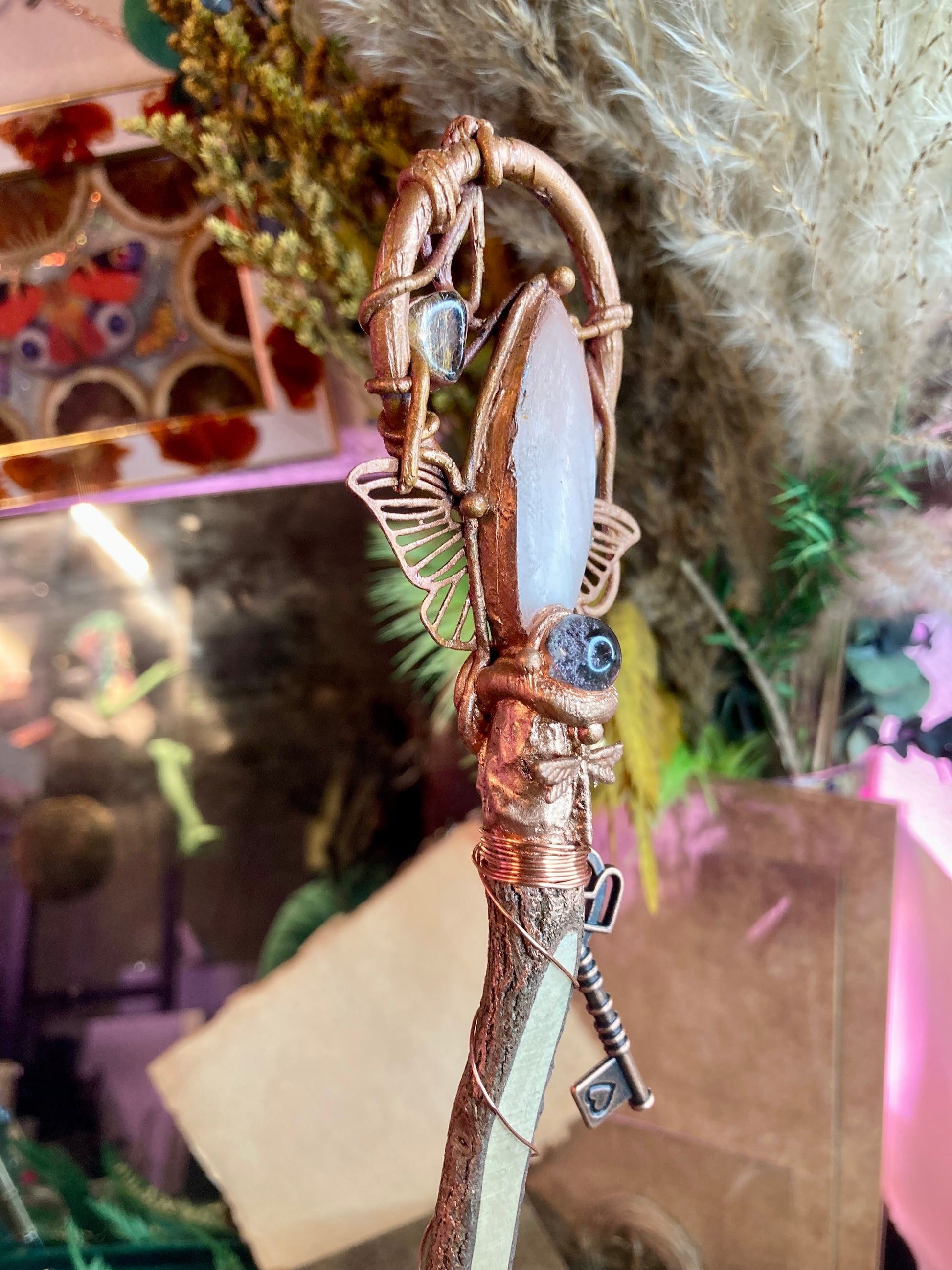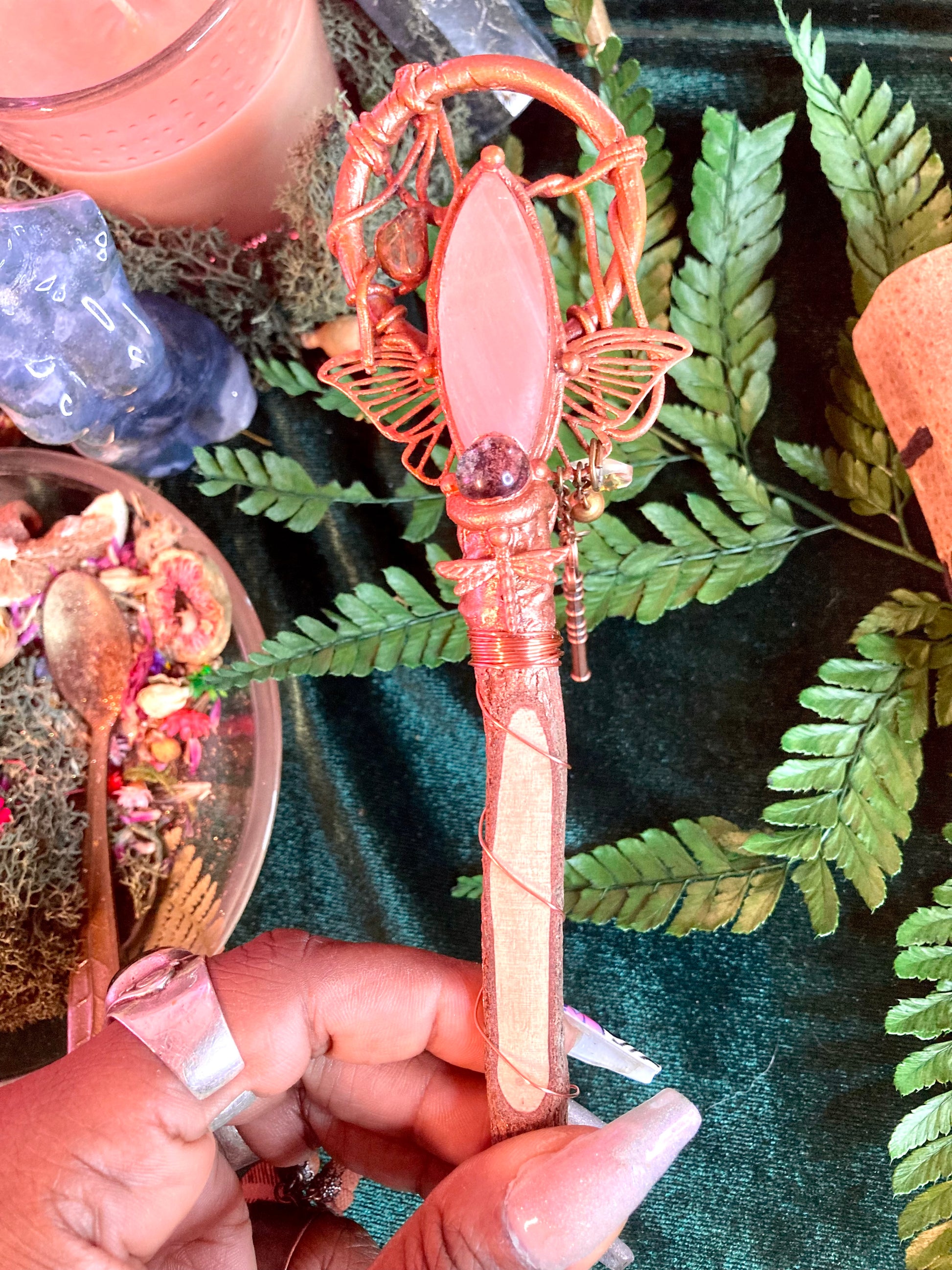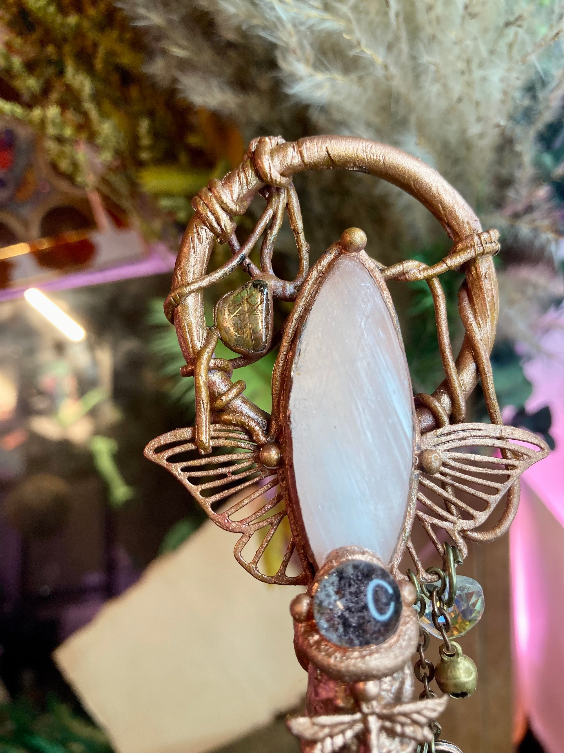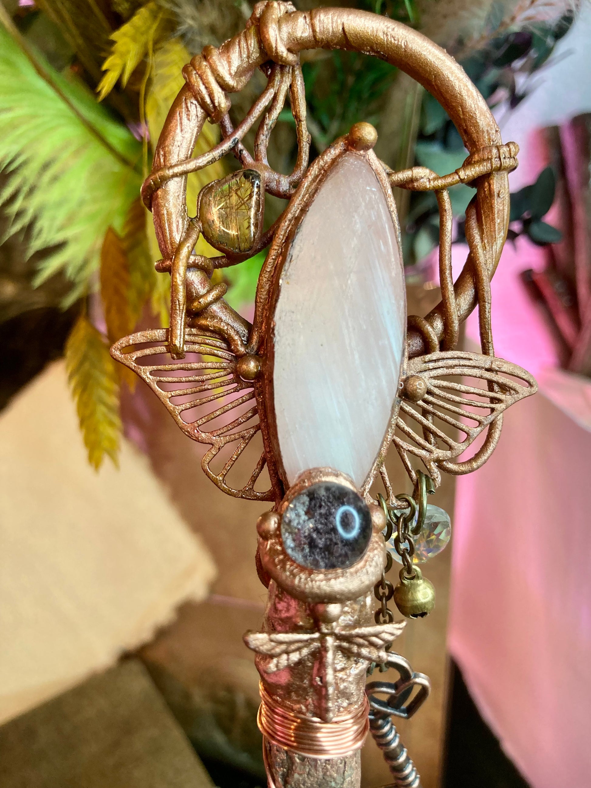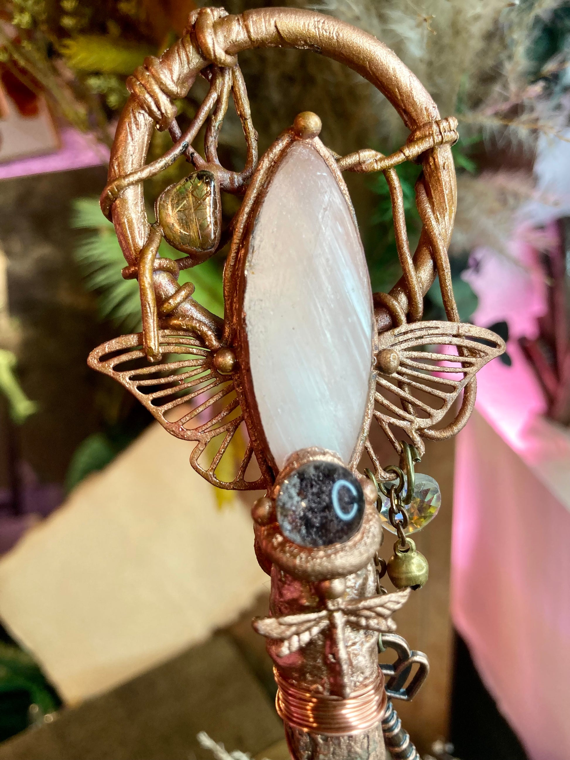Introducing the Selenite Perception Pencil, featuring a stunning selenite center eye stone known for its purification, clearing, and positive energy properties. Adorned with intricate leaf, vine, and fae details, this pencil's soft white appearance is a perfect reflection of its gentle yet highly effective energy. The included Gold Rutile quartz stone can assist with relieving fears and phobias, making this pencil a great meditation and manifestation tool. The garden quartz enhance communication with higher realms, stimulate spiritual growth, and increase awareness of the natural world