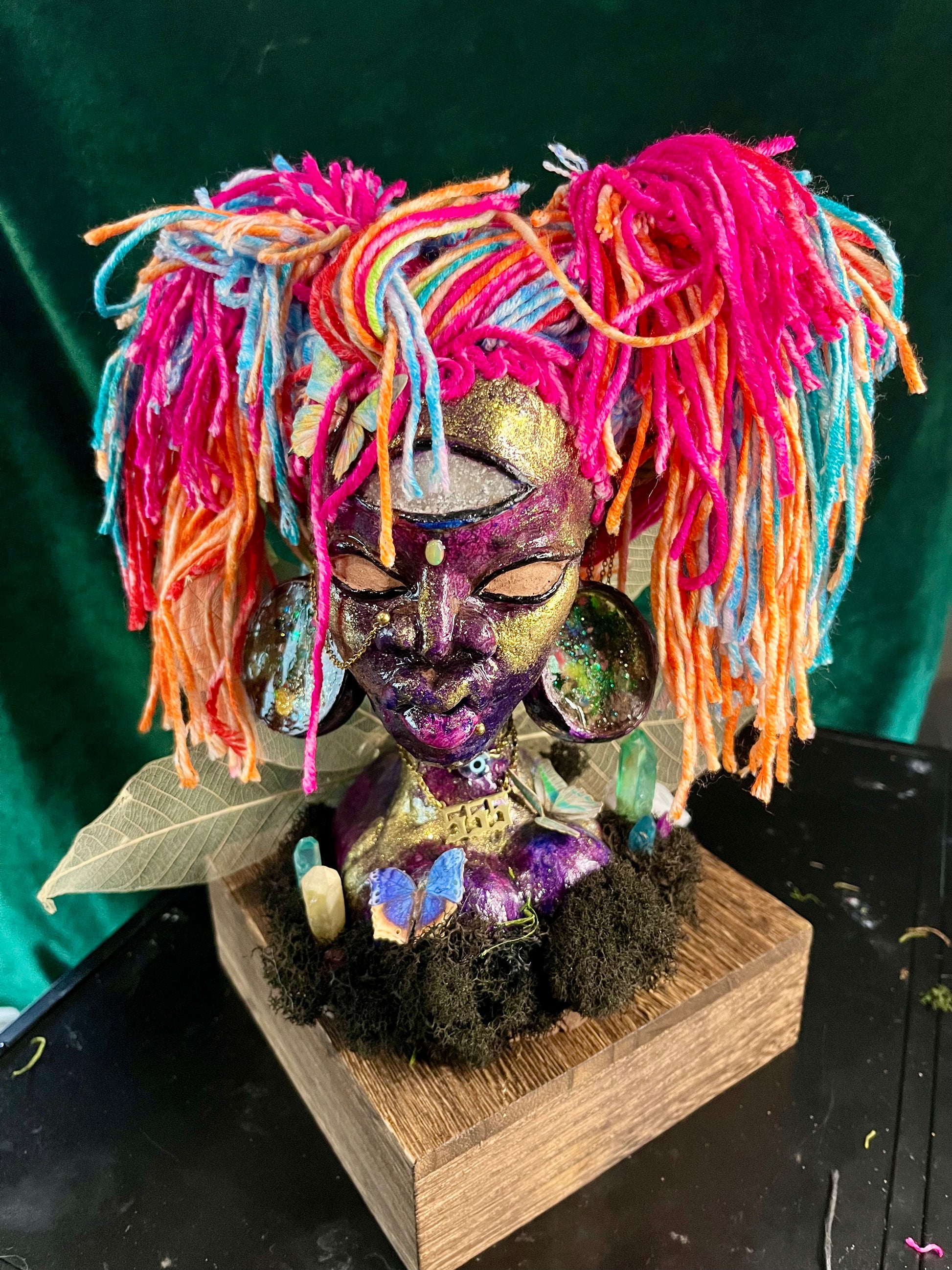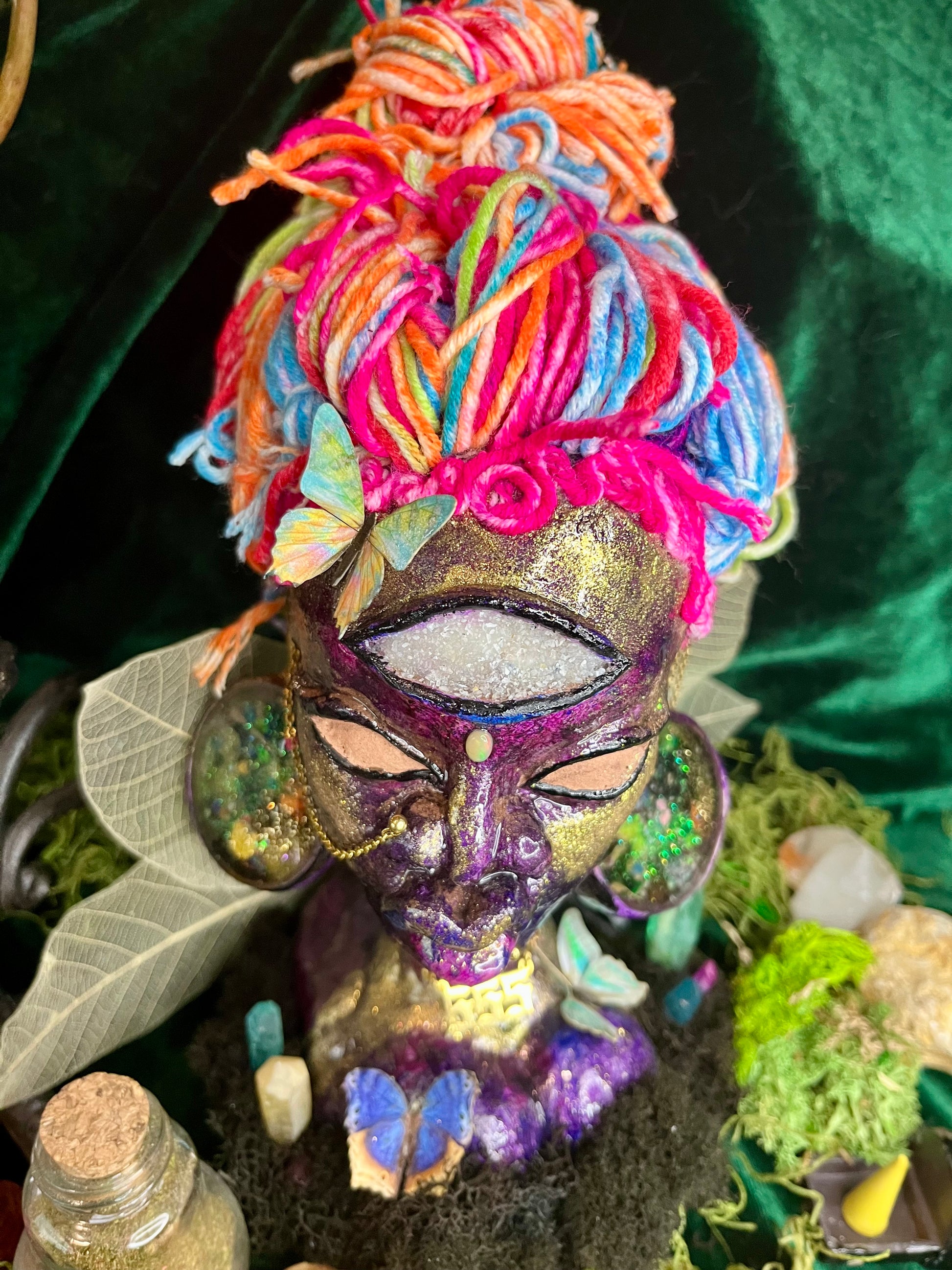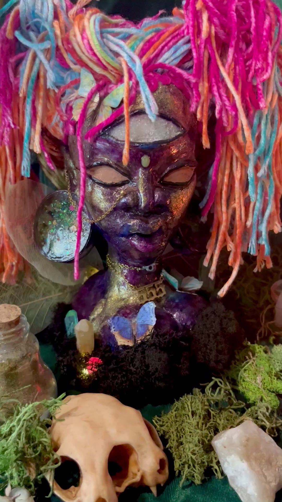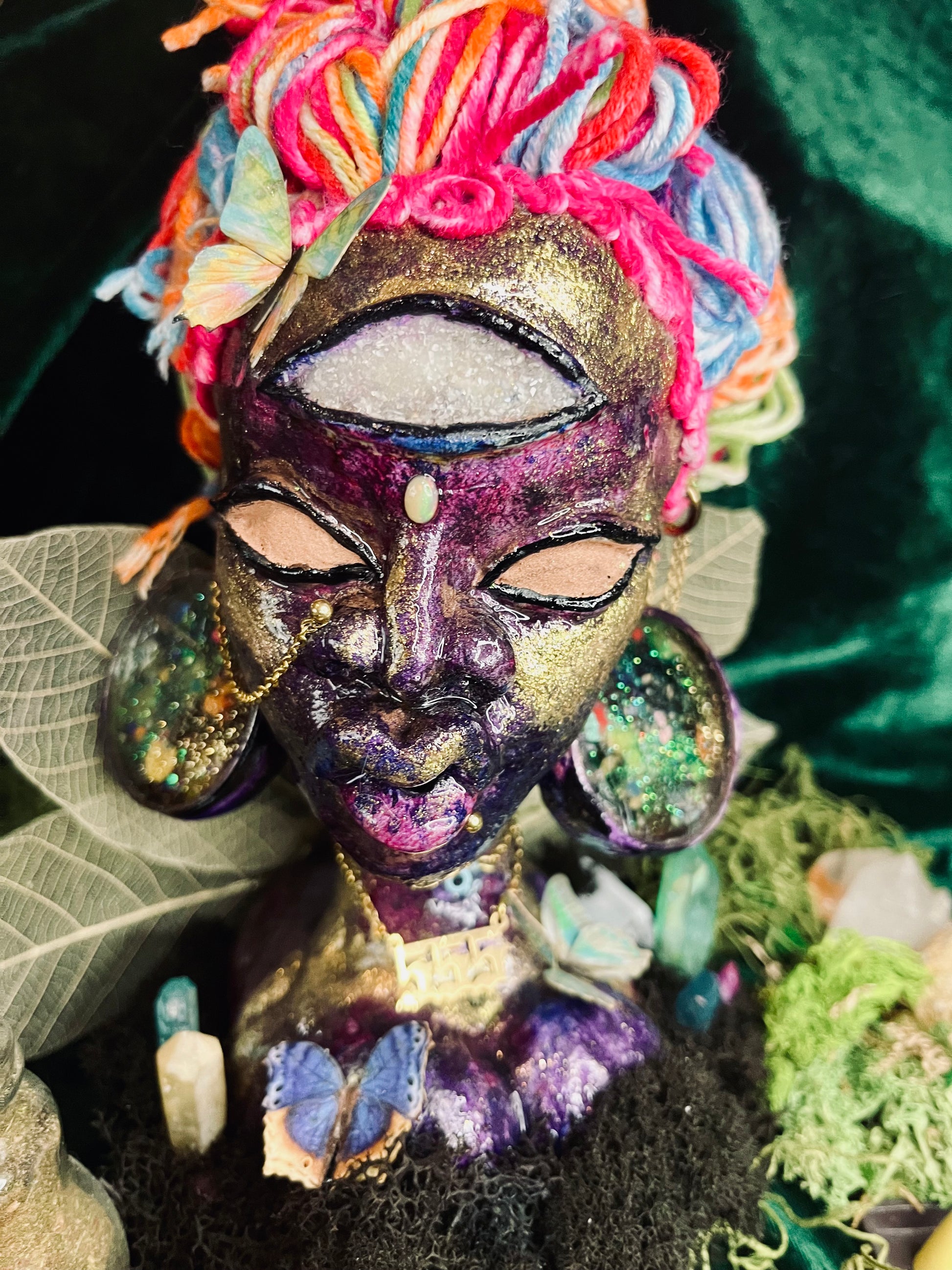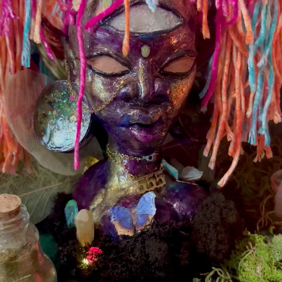 Discover the enchanting She, a Fairy of many wonders. Made with mixed medium, her hair is posable and she lights up both day and night. Adorned with a Moonstone third eye and Opal underneath, her main eyes shine brilliantly with copper base aligned with aura quartz. A beautiful and functional addition to any space.