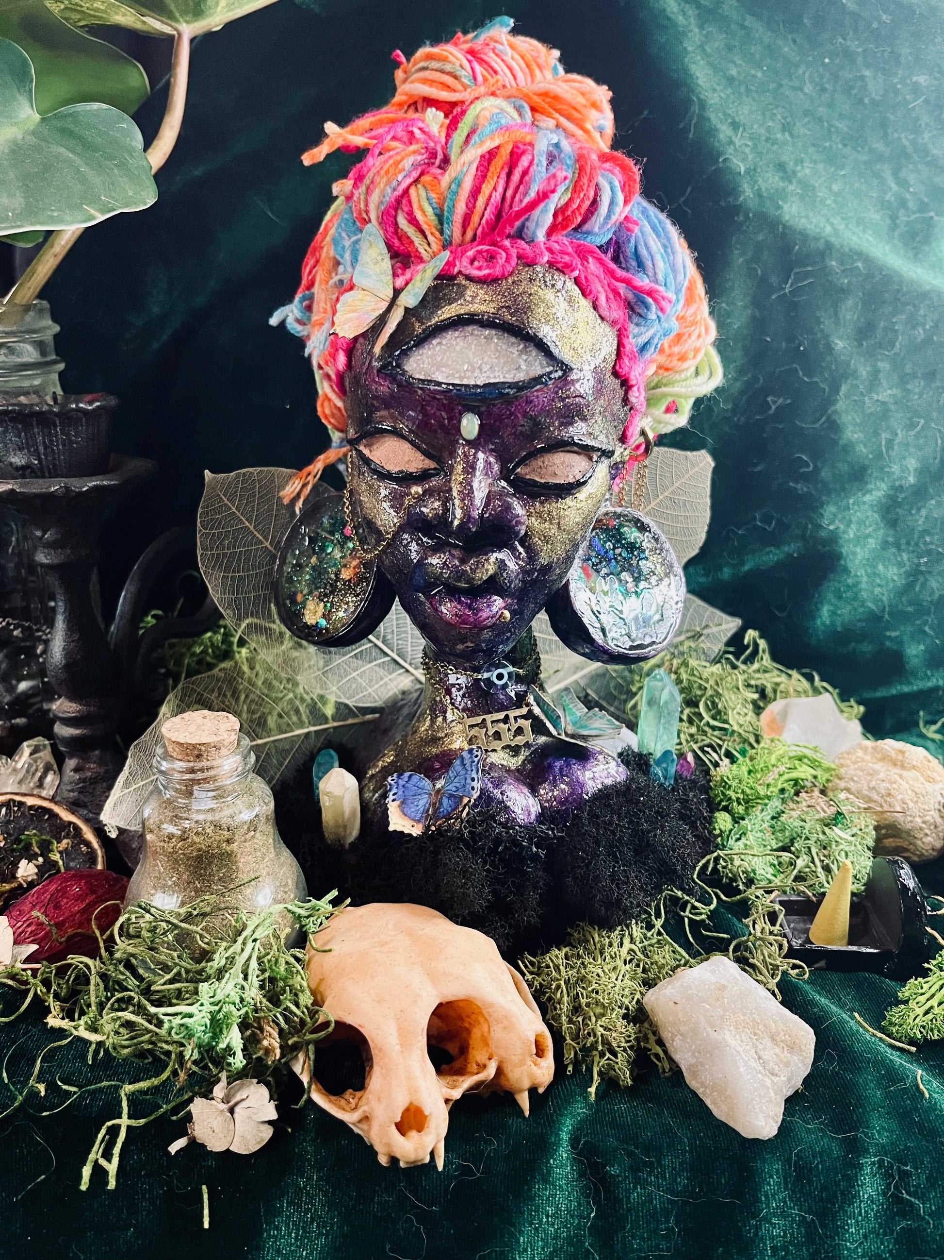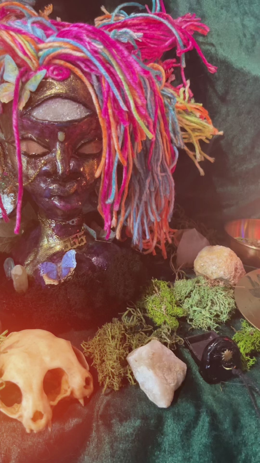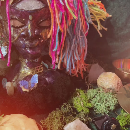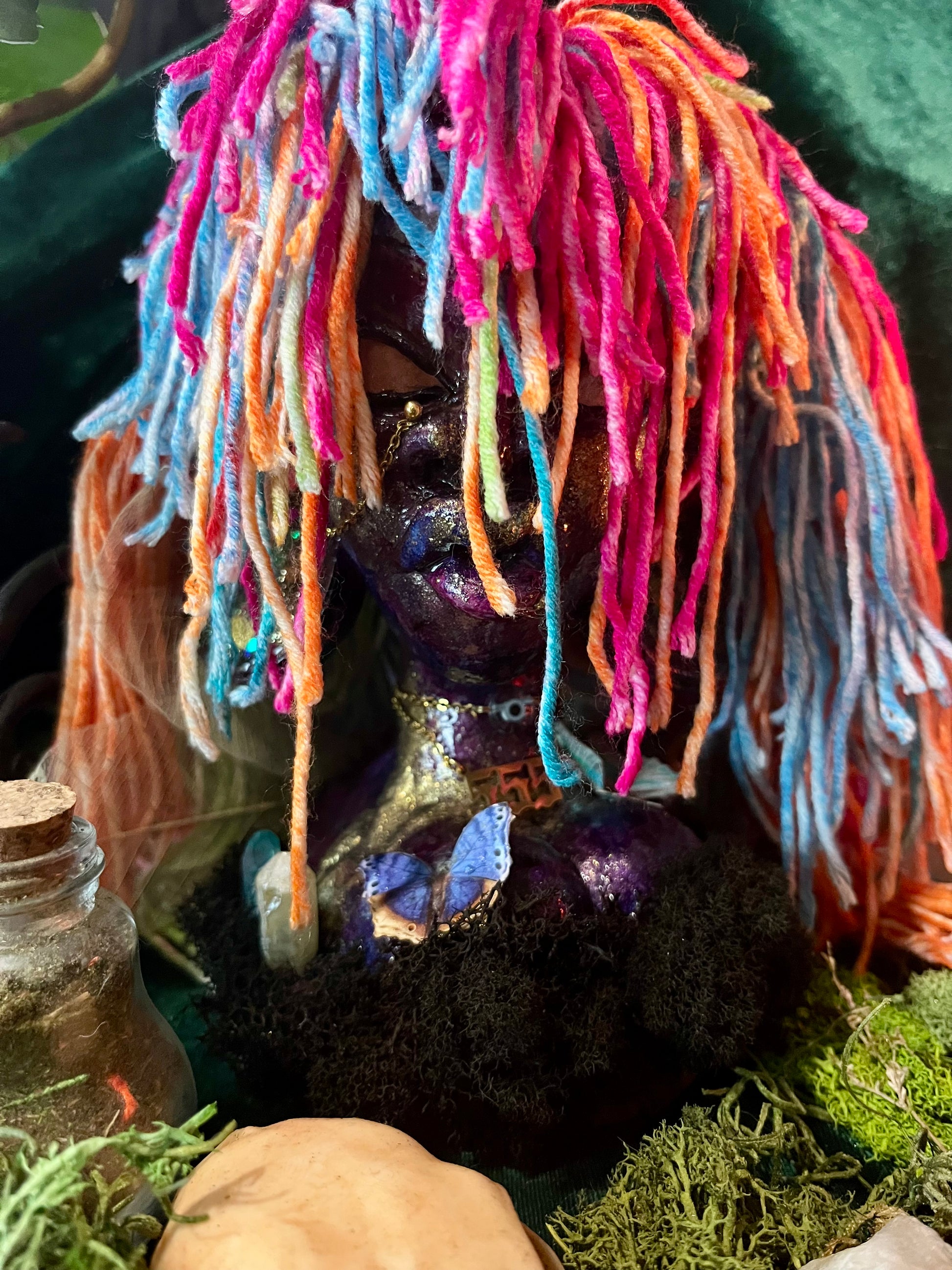 Discover the enchanting She, a Fairy of many wonders. Made with mixed medium, her hair is posable and she lights up both day and night. Adorned with a Moonstone third eye and Opal underneath, her main eyes shine brilliantly with copper base aligned with aura quartz. A beautiful and functional addition to any space.