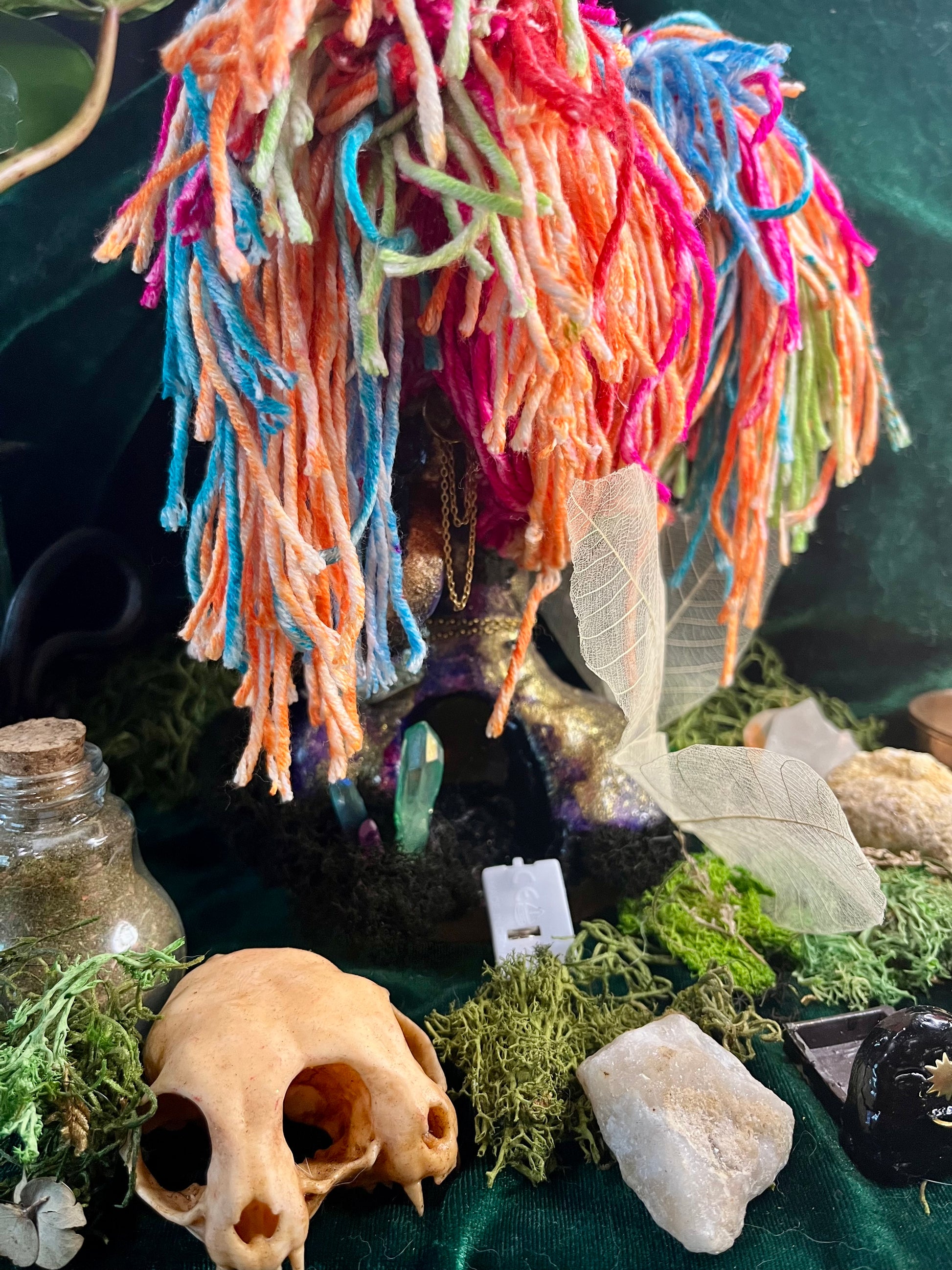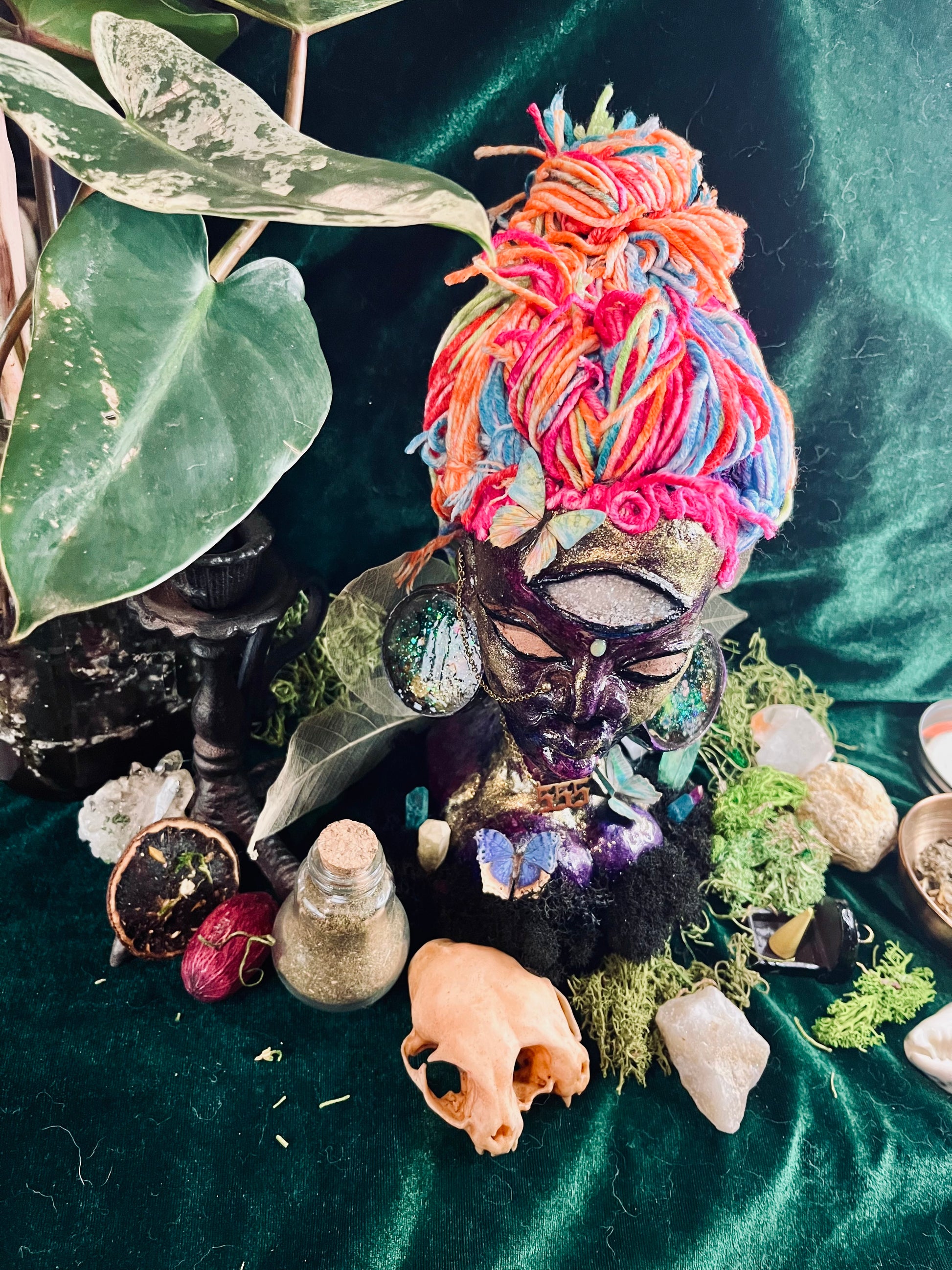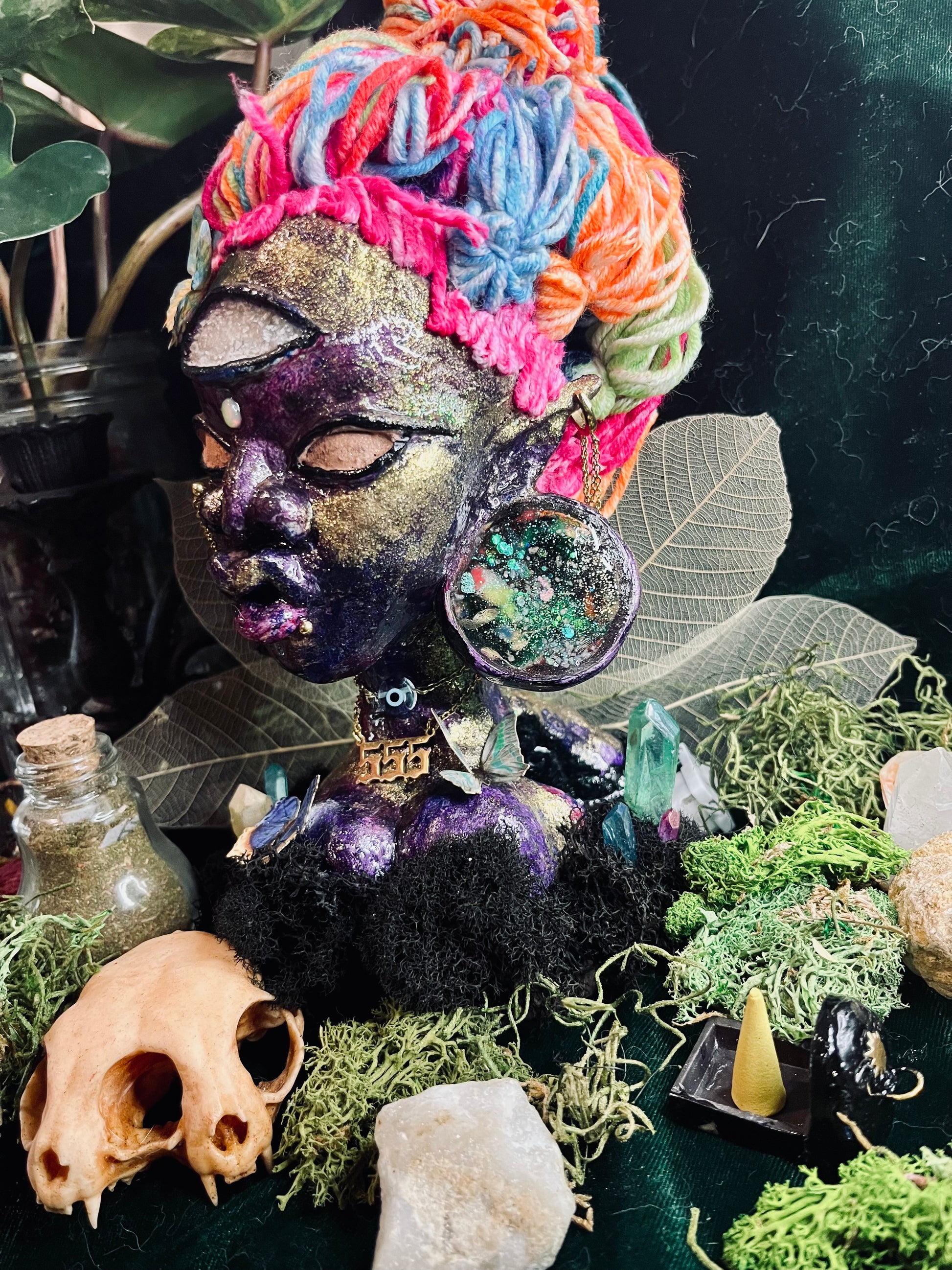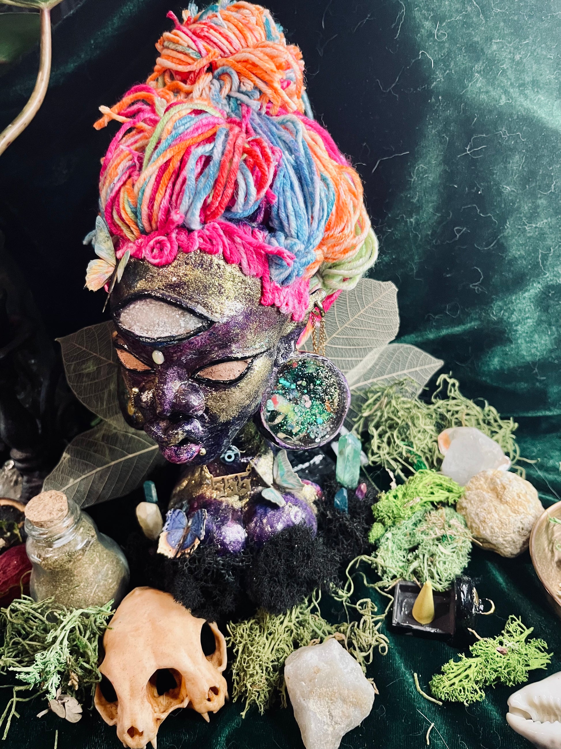 Discover the enchanting She, a Fairy of many wonders. Made with mixed medium, her hair is posable and she lights up both day and night. Adorned with a Moonstone third eye and Opal underneath, her main eyes shine brilliantly with copper base aligned with aura quartz. A beautiful and functional addition to any space.